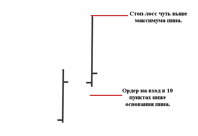 ордер в 10 пунктах ниже (выше) основания пин бара. Стоп-лосс рекомендуется